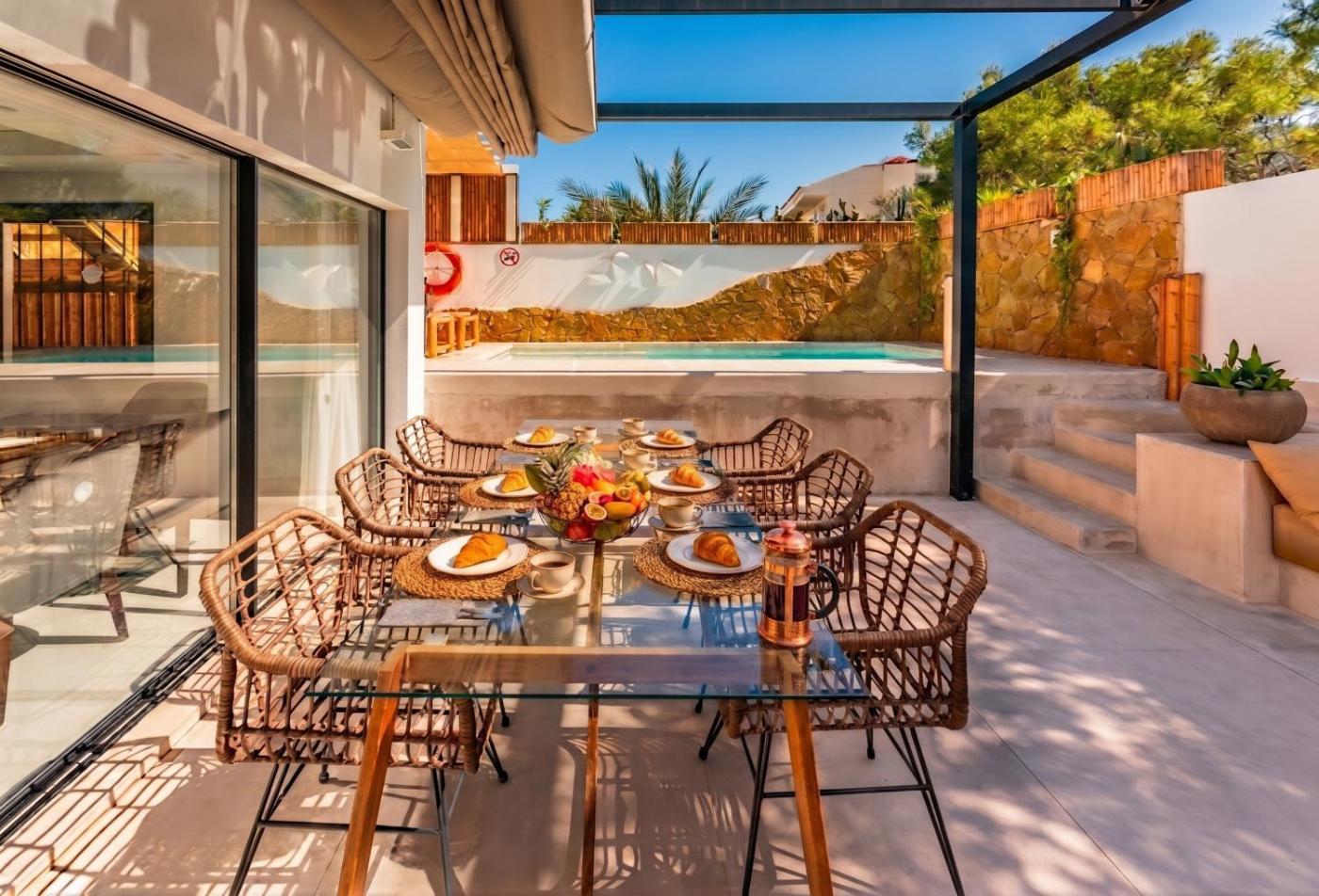 Villa con piscina privada. Boasting a private entrance and a pool, this air-conditioned villa comes with 1 living room, 3 separate bedrooms and 3 bathrooms with a walk-in shower and a bath. Guests will find a stovetop, a refrigerator, a dishwasher and kitchenware in the well-fitted kitchen. The villa also includes a barbecue. Featuring a terrace with sea views, this villa also features a washing machine and a TV with streaming services. The unit has 3 beds.
